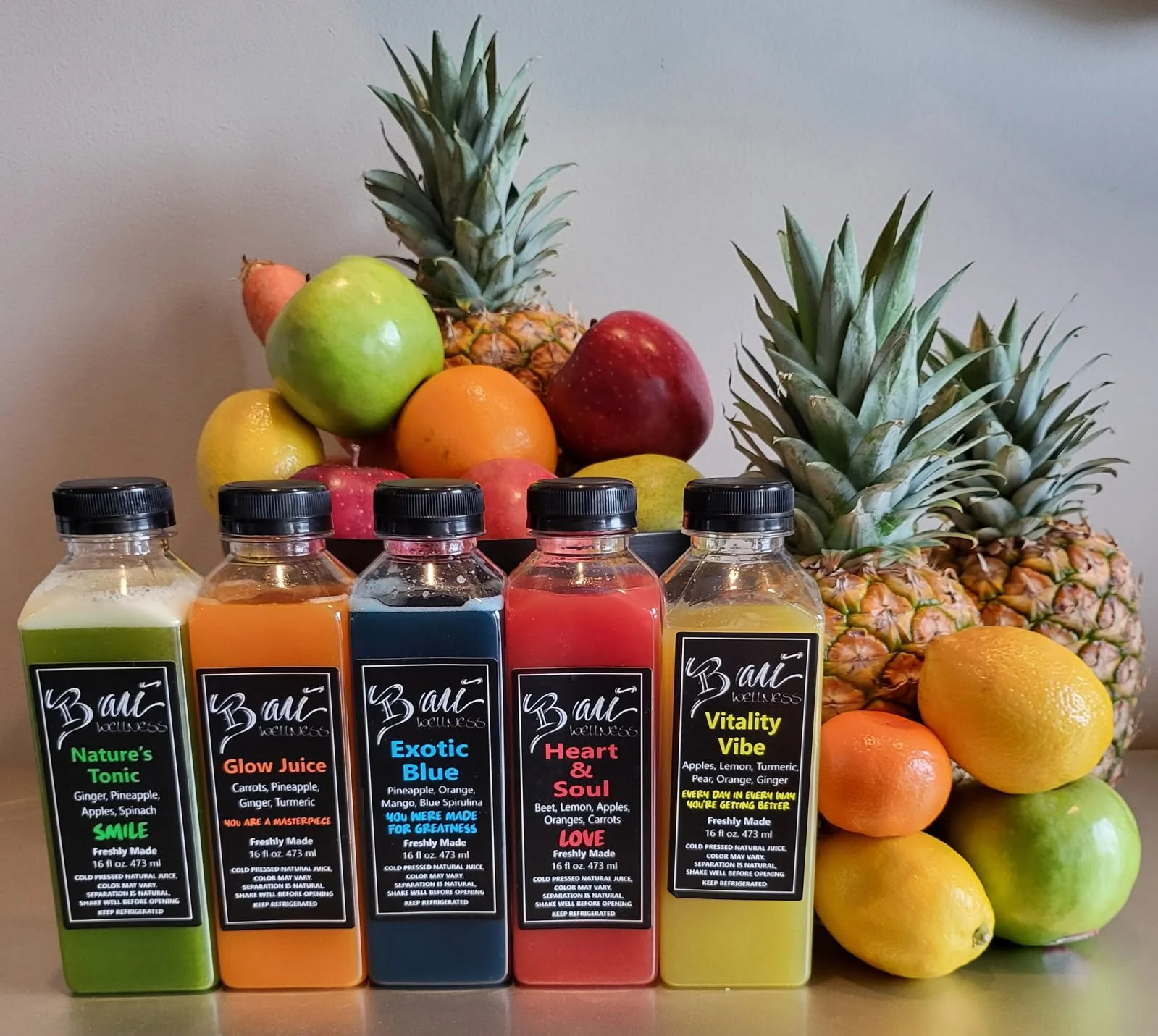Bar’i Wellness provides cold pressed juice that is full of whole fruits and vegetables WITHOUT added sugar or additives.